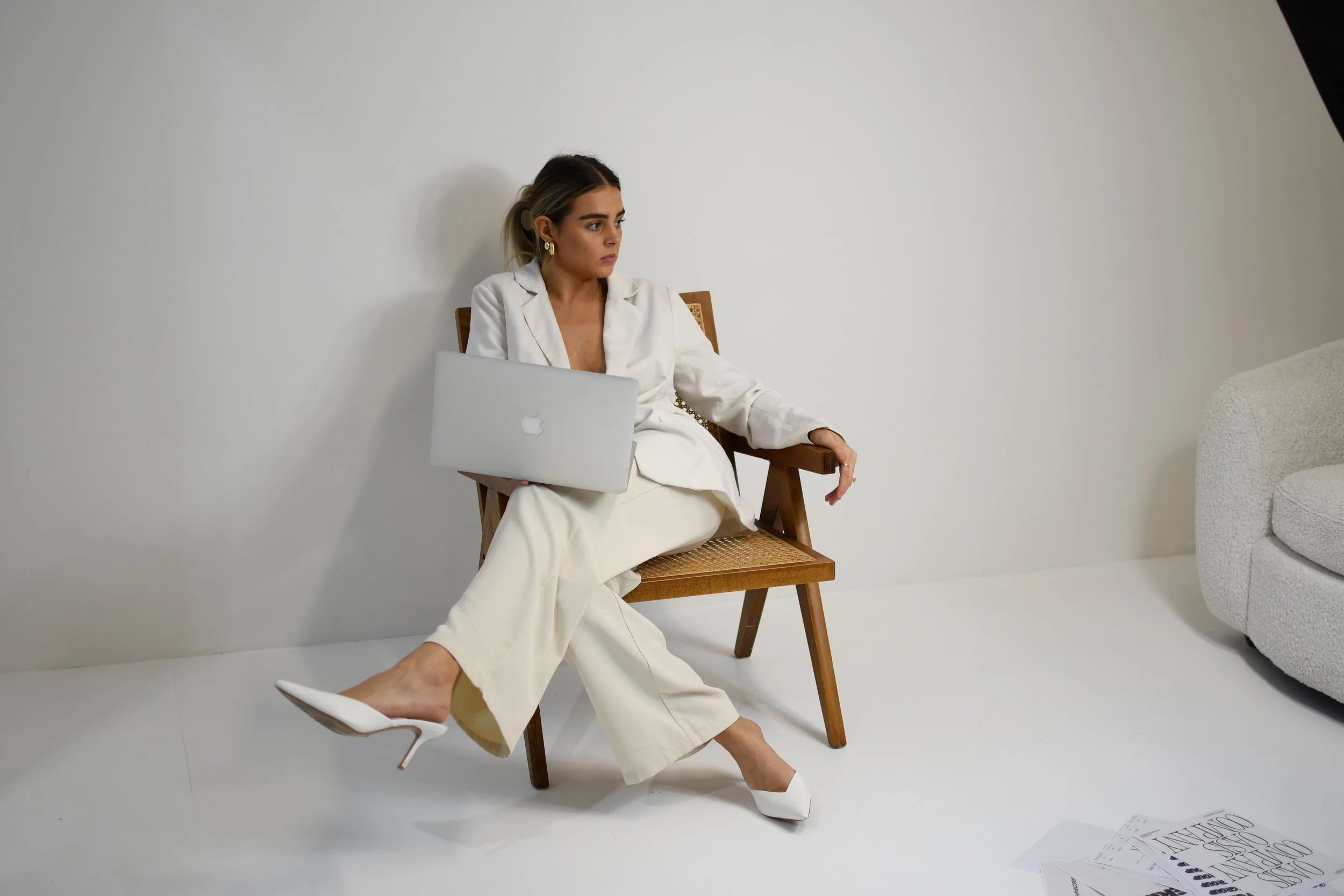 A woman dressed in white sits on a wooden chair in a minimalist room, holding a silver laptop on her lap, with her legs crossed and wearing white high heels, looking to the left.
